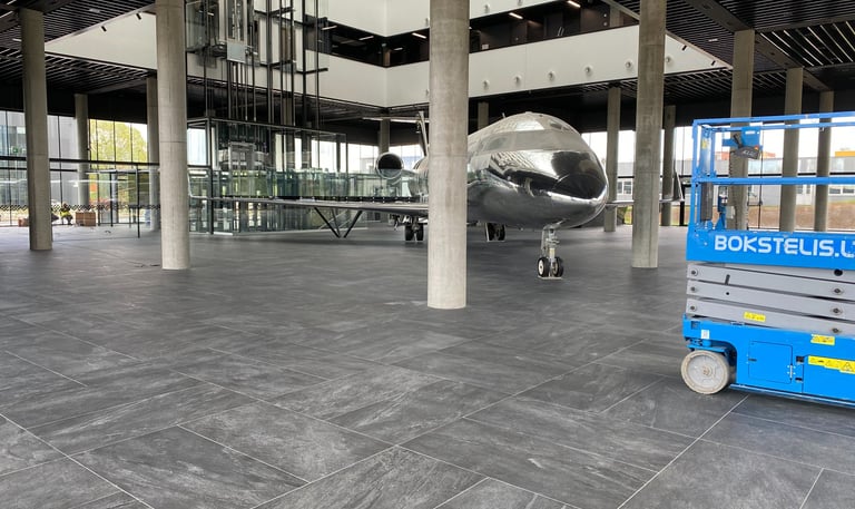 Dirbant subrangoje suklijavome 2700 m2 įvairaus dydžio plytelių, pramoniniu būdu nudažėme 2350 m2 lubų ir nuglaistėme bei dažėme 1600m2 biurų patalpų.